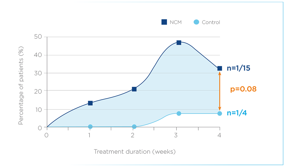 In the subpopulation with post-traumatic/surgical wounds, 59% (10/17) of patients treated with NCM reached more than 75% coverage with LRG tissue after 4 weeks vs. 25% (3/12) in the control group (p=0.07).
