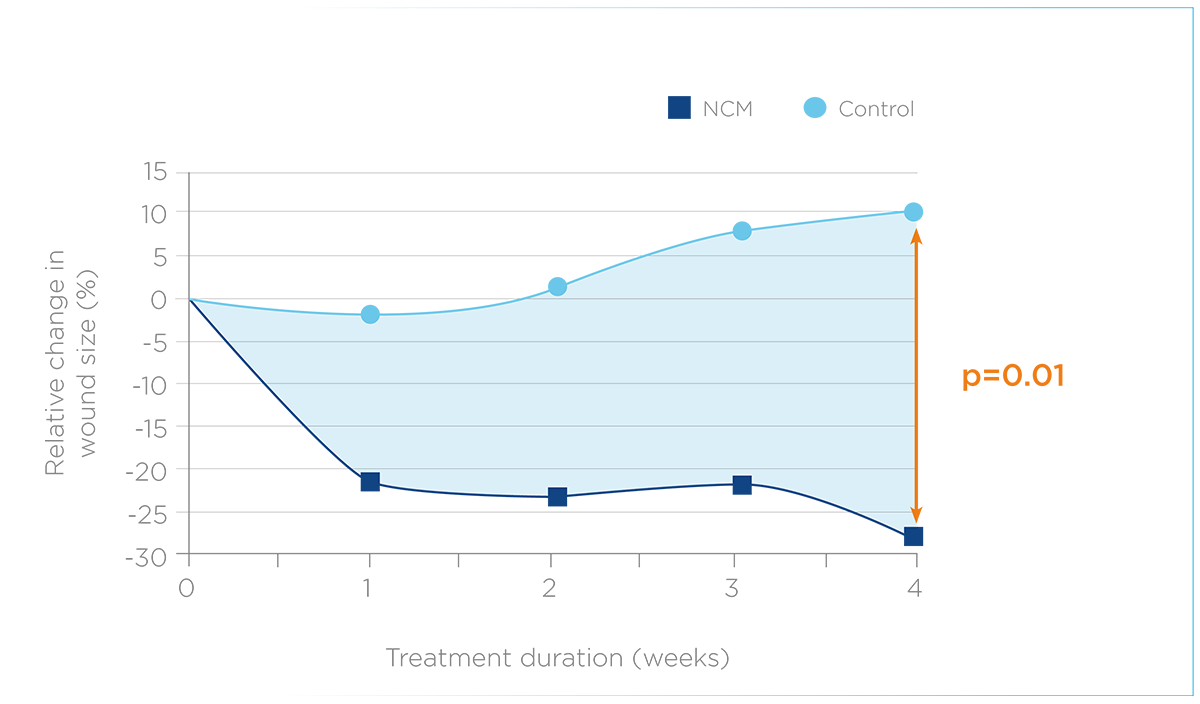The patients with venous insufficiency treated with NCM achieved a 27.3% (p=0.01) reduction in wound size vs. a 10% increase in the control group.
