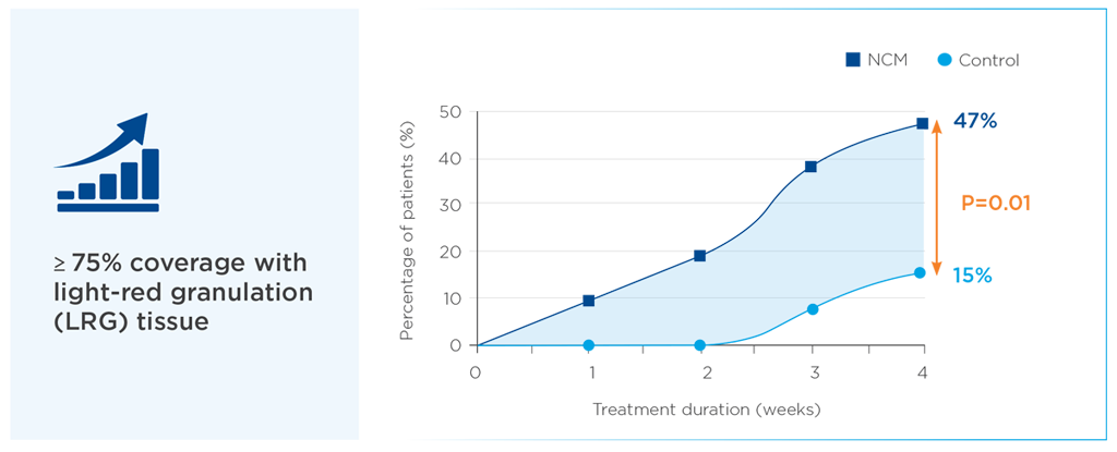 47% of patients treated with NCM reached more than 75% coverage with LRG tissue compared with 15% in the control group (OR=5.95; p=0.01).”
